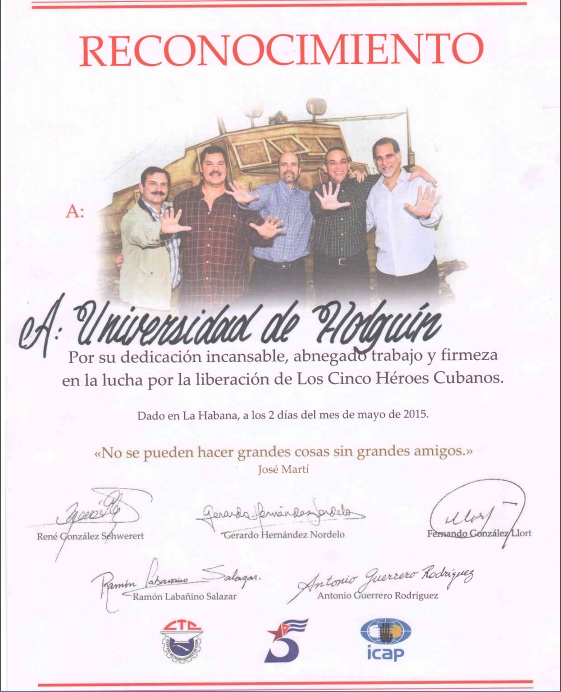 Acabamos de conocer una excelente noticia: la Universidad Integrada recibió, de parte de nuestros Cinco Héroes Cubanos, un especial reconocimiento por su dedicación incansable, abnegado trabajo y firmeza en la lucha por su liberación. El mismo fue motivo de alegría y orgullo para la dirección del centro a quien se entregó y para toda la comunidad universitaria que hoy conoce de este gesto de nuestros hermanos.