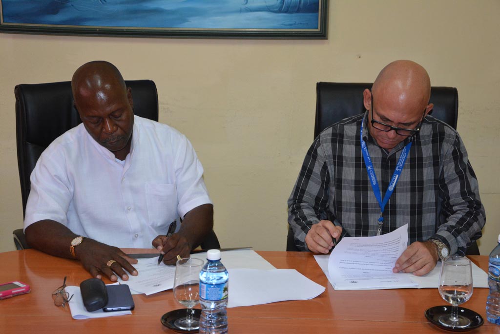 El Dr. C. Reynaldo Velázquez Zaldívar (izq), Rector de la Universidad de Holguín, y el Dr. Girard Vernaza Arroyo, Rector de la Universidad Técnica "Luis Vargas Torres", de Esmeraldas, Ecuador, firman Convenio Marco entre ambas instituciones. UHO FOTO/Luis Ernesto Ruiz Martínez-Dircom