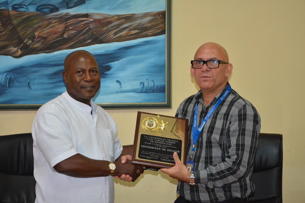 El Dr. Girard Vernaza Arroyo manifestó su admiración por el desarrollo de la Universidad de Holguín y de manera especial su contribución a la educación no solo de la institución que dirige, sino a todo Ecuador. Antes de proceder a la firma del Convenio Marco, entregó un Reconocimiento especial a la casa de altos estudios holguinera, por su fructífera labor en la formación de profesionales de alto nivel en este continente.