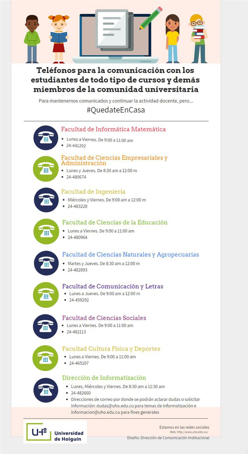 Se debe garantizar, por diferentes vías, las respuestas a las inquietudes de la población holguinera, la aclaración de dudas o inquietudes a padres, familiares o estudiantes. Se han divulgado los teléfonos de cada una de las facultades y estructuras de dirección de la Universidad para ello.