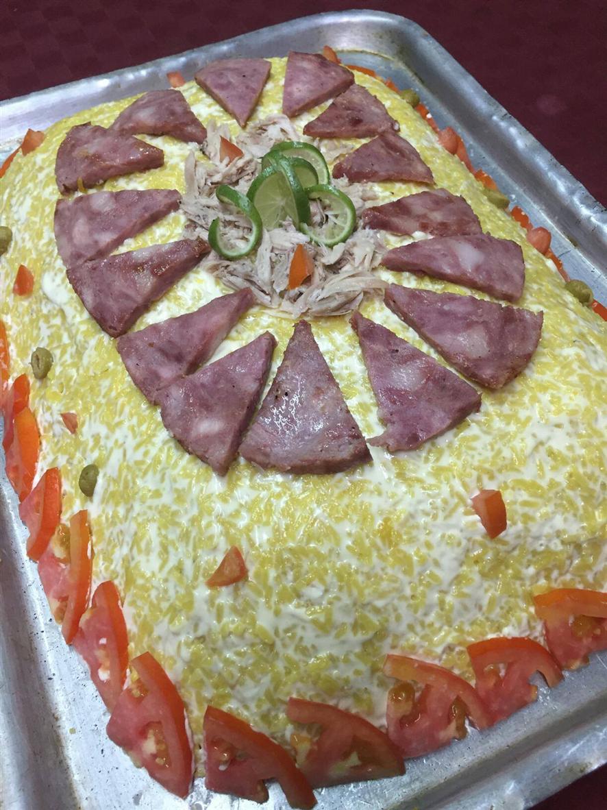 Preparación: Picas y sofríes el tomate, la cebolla y el ajo, lo mezclas con el arroz previamente lavado y lo cocinas por 7 min. Recuerda cocinar el pollo y el cerdo juntos y emplear este caldo como base de cocción para el arroz. Cuando estén listas las carnes, desmenúzalas y pica finamente el embutido. En una bandeja grande coloca por capas, el arroz, la mayonesa, el embutido y las carnes, hasta que se agoten todos los ingredientes.