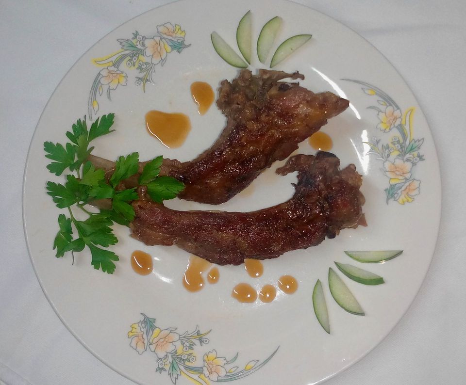 Ingredientes: costillas de cerdo, salsa roja, salsa de tomate, miel, ramas de perejil para decorar, lechuga, pimientos rojos, pepino, salsa mayonesa y arroz.