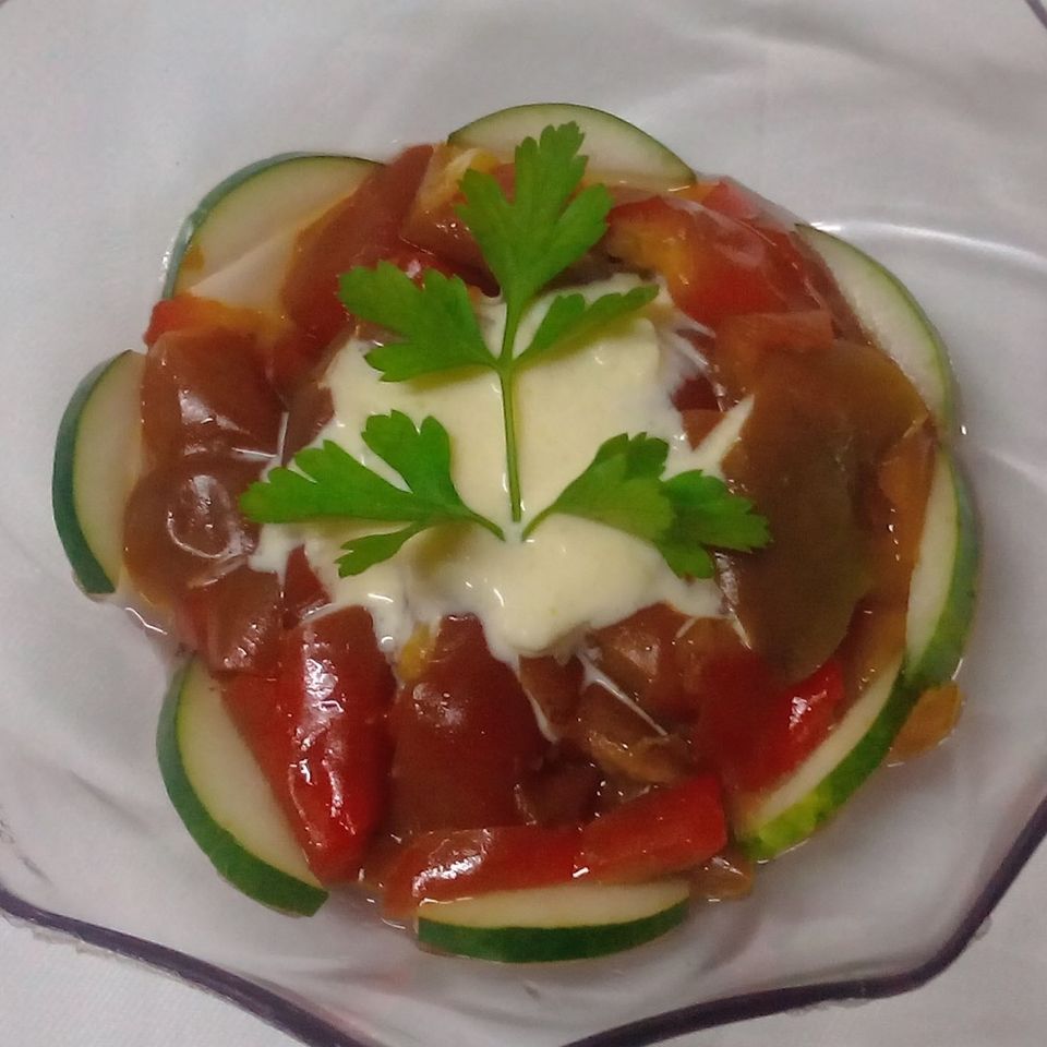 Preparamos una mayonesa casera. Lavamos bien el pepino, la lechuga, el perejil y los pimientos, luego picamos en tiras pequeñas. El pimiento debe cocinarse por unos minutos. En un plato mezclamos perejil, lechuga y aderezamos con sal y aceite.