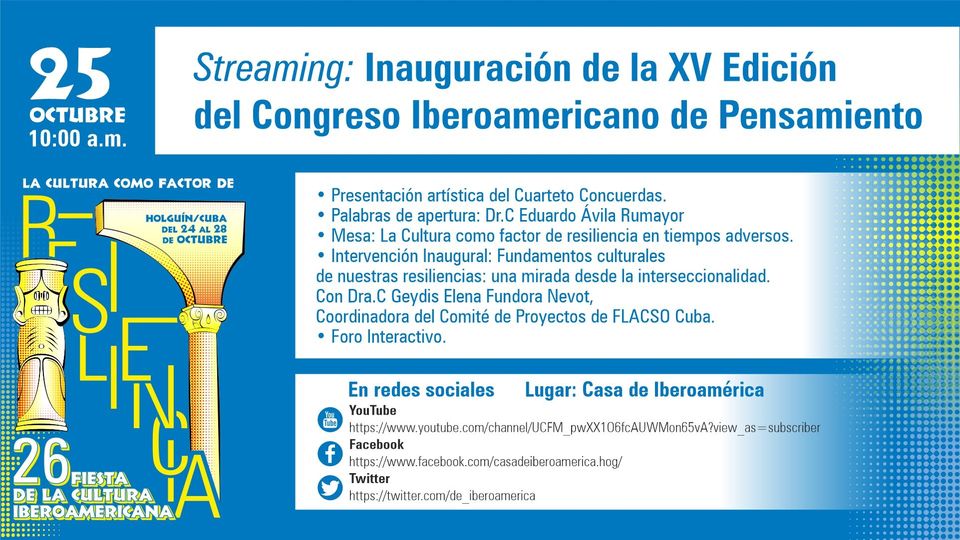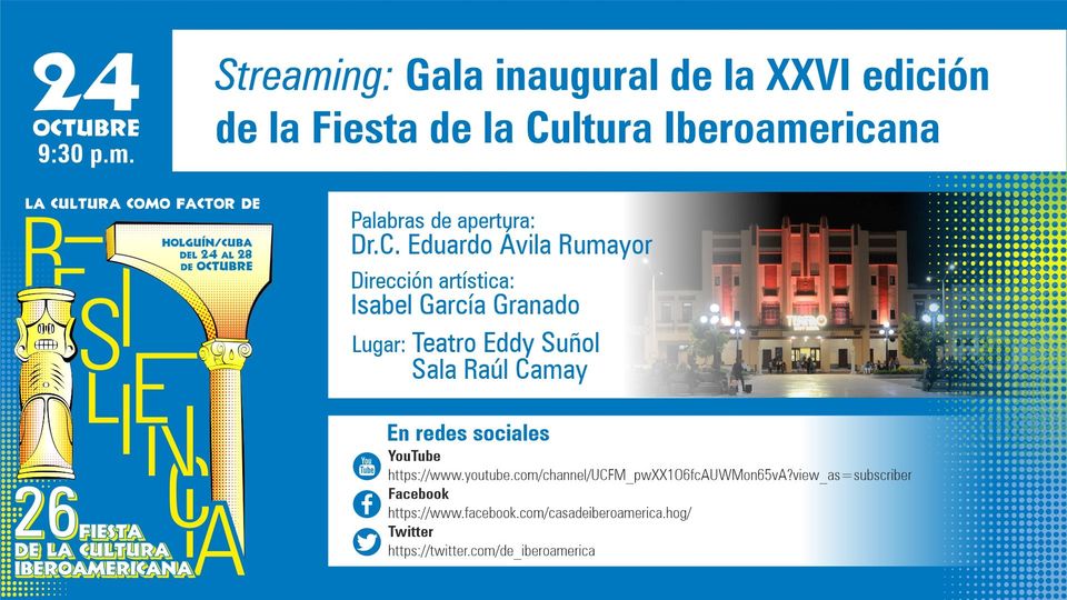 9:30 PM. Streaming: Gala Inaugural de la XXVI Edición de la Fiesta de la Cultura Iberoamericana. Palabras de apertura a cargo del Dr.C. Eduardo Rafael Ávila Rumayor, Presidente del Comité Organizador.