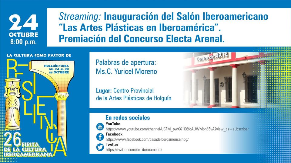 8:00 PM.- Streaming: Inauguración del Salón Iberoamericano “Las Artes Plásticas en Iberoamérica”. Palabras de apertura por la Ms.C. Yuricel Moreno. Premiación del Concurso Electa Arenal.