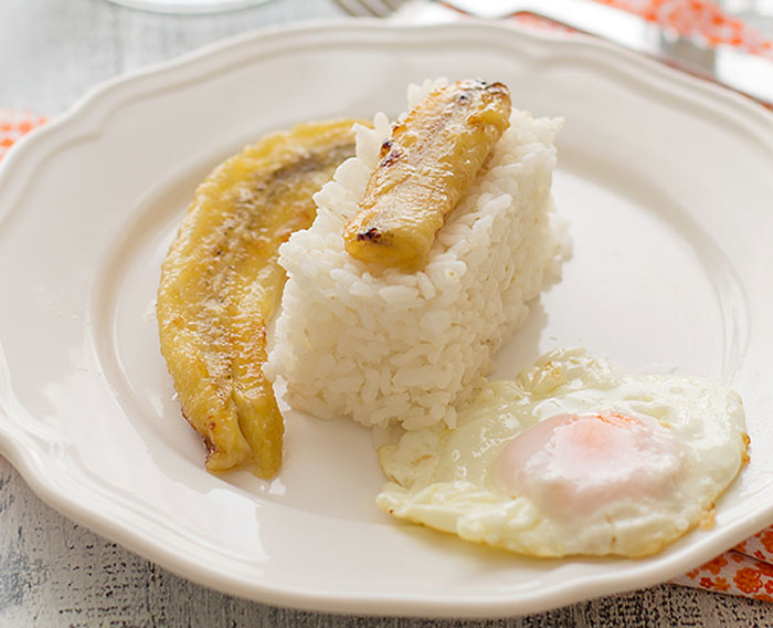 Repartimos el arroz en moldes apretando ligeramente con la cuchara para que tome forma y servimos junto al plátano y al huevo frito.