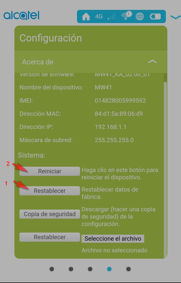 Luego reinicia el rúter presionando por 10 segundos el botón de encendido. También puedes hacerlo desde el menú Configuración, Reiniciar.